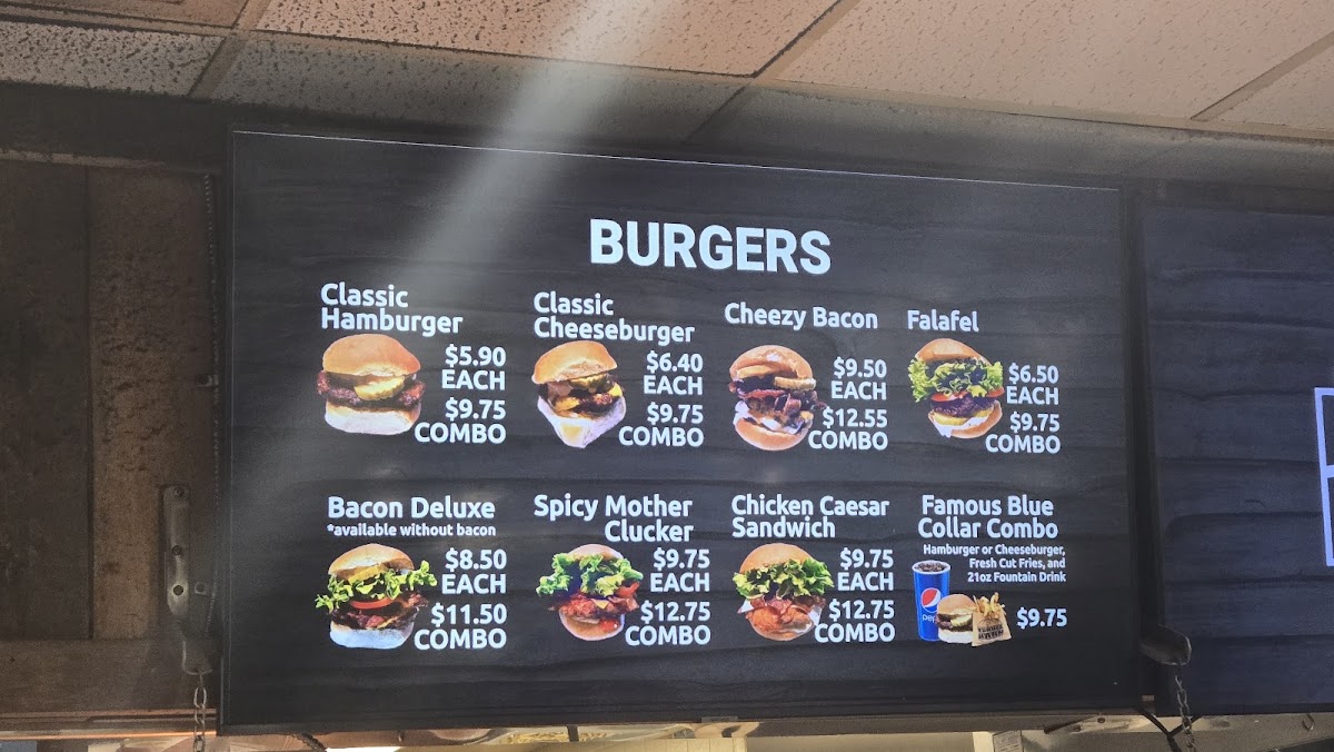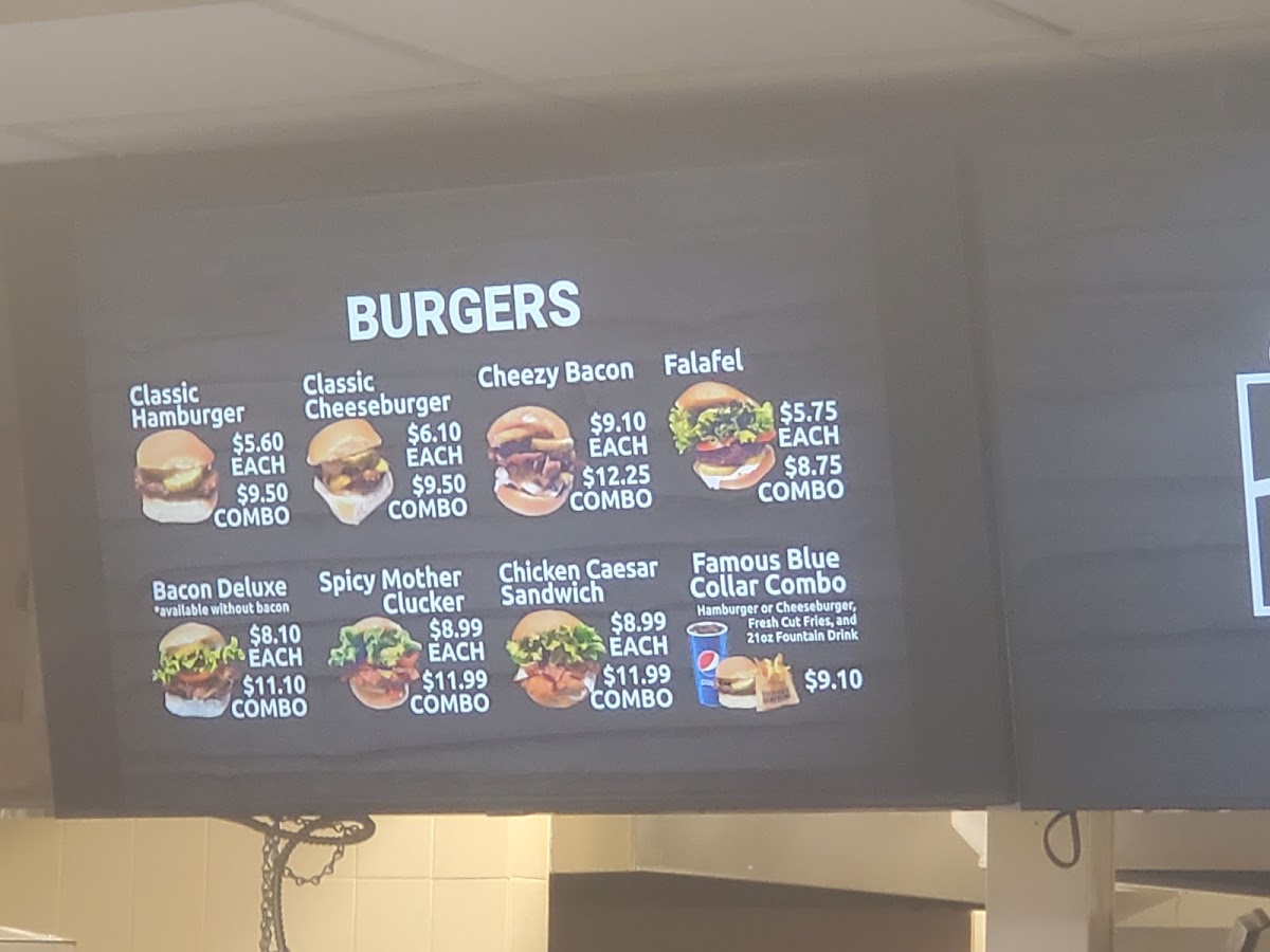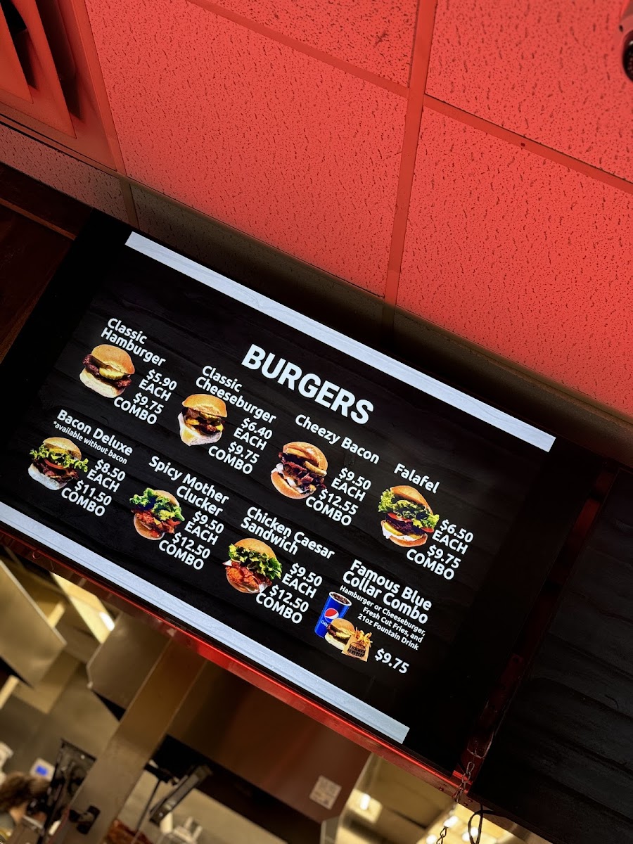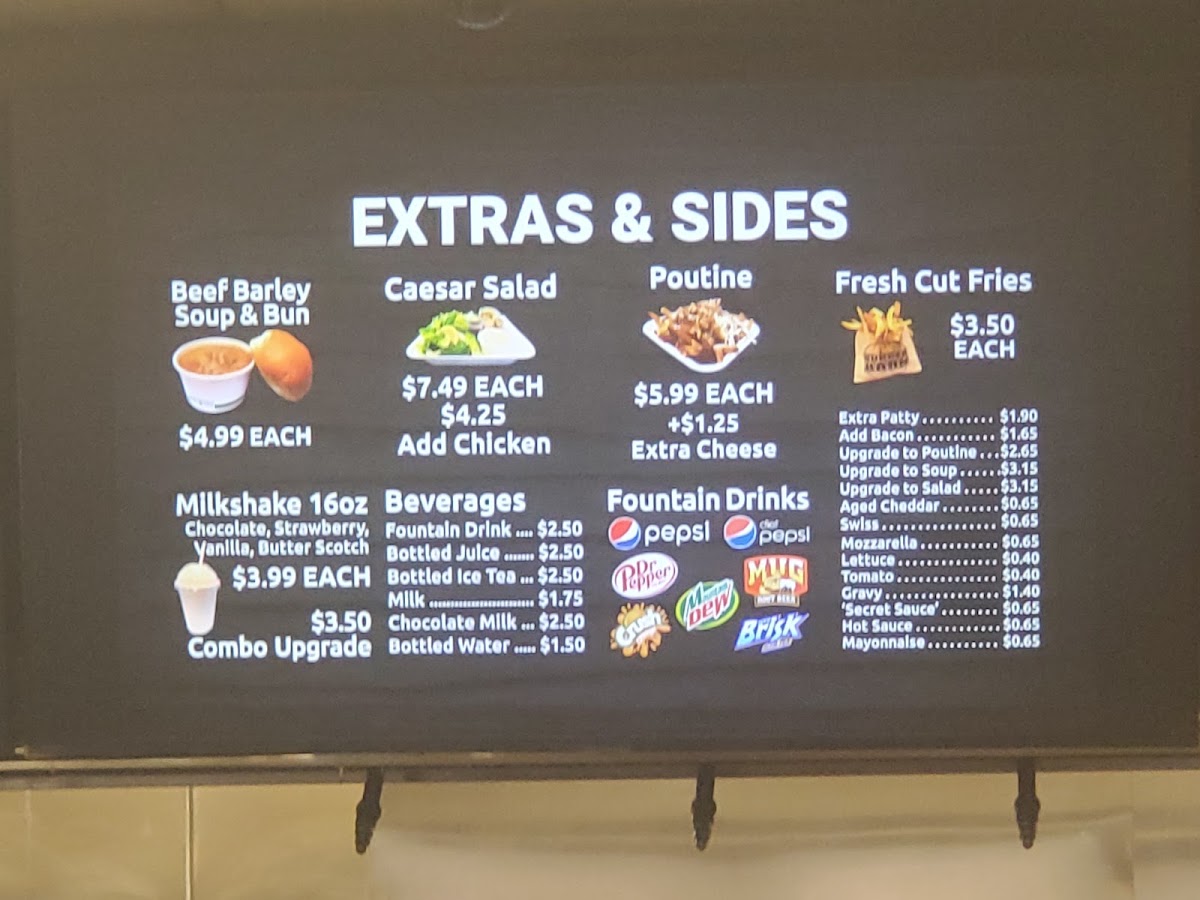 You’ll find options like the spicy Mother Clucker, the hearty Double Bacon Cheeseburger, and the vegetarian-friendly Falafel Burger, making it easy to find something that suits your mood. Sides such as poutine and Caesar salad complement the main dishes, while a range of simple drinks—from bottled juices to chocolate milk—keep things easy and refreshing.